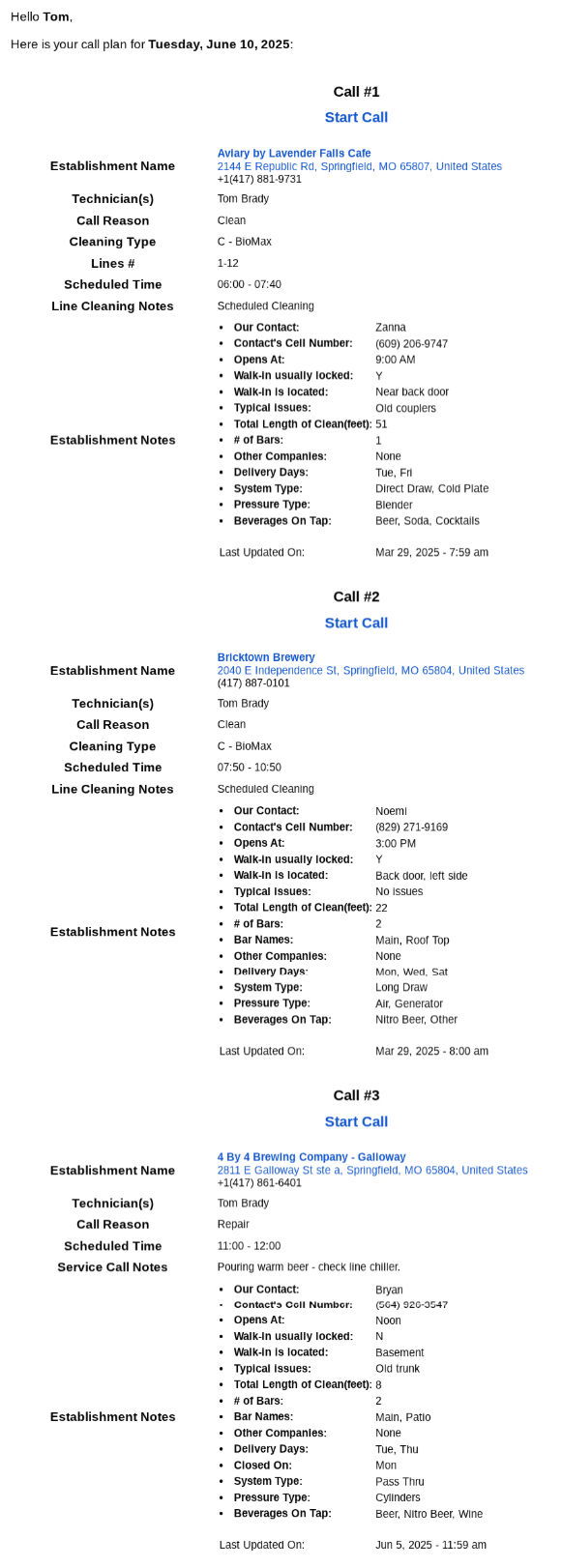 Your technicians will receive their call plans in the afternoon for the following day as the Tap Trackers system automatically sends them at 3pm Eastern Sunday - Thursday.