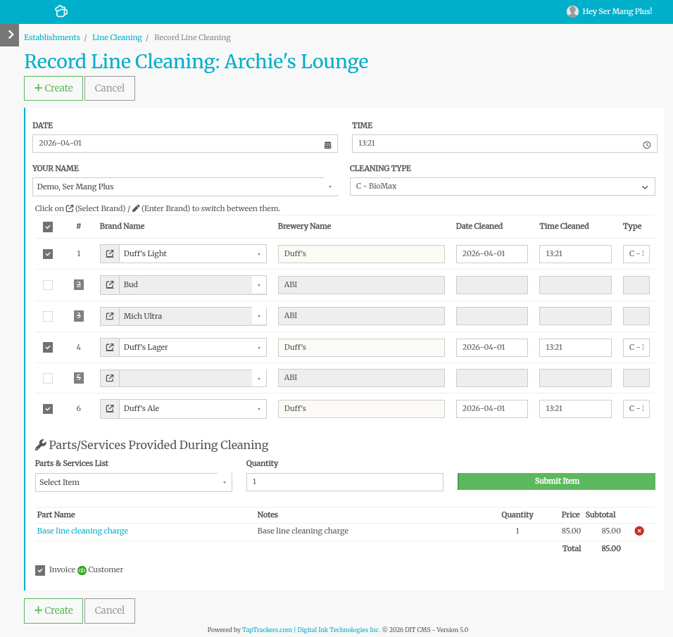Lines that you do not normally clean are shown in gray and with a line through the text. These are Non-Tracked lines that you normally do not clean. If you need to change a Non-Tracked line to a Tracked Line, you can change the brand on this page by selecting the new brand from the drop-down or typing it in.