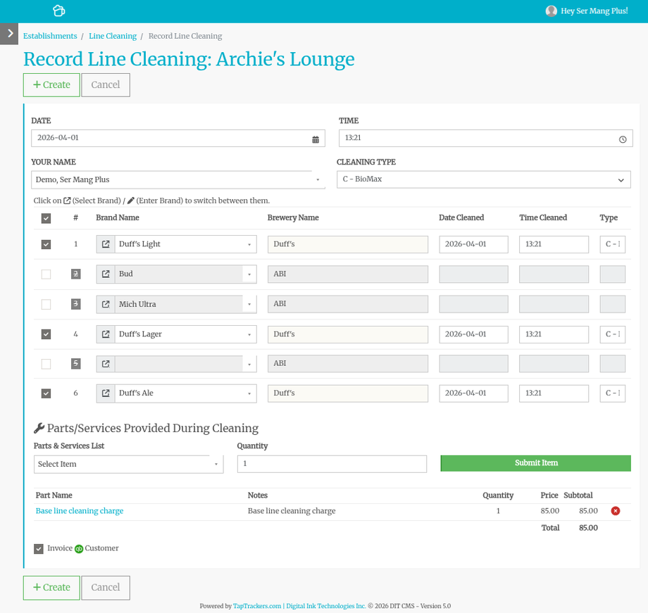 Select the time, date, and type of clean you did. Then check off the lines that you cleaned.