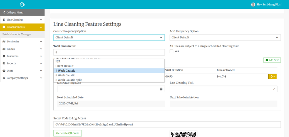 Suppose an establishment has a different cleaning frequency than the company standard (for example, subscribing to every 4-week line cleaning instead of every 2 weeks, like the majority of your customers). In that case, you can change it for that single establishment.