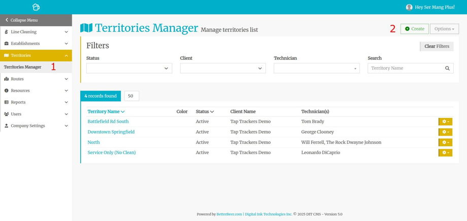 Think of territories as a geographical area that one or two techs will cover. It will consist of routes, each with stops.